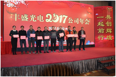 其次董事长吴龙平先生为2016年为丰盛光电做出重大贡献的公司先进个人、先进班组授予荣誉证书,吴总号召全体员工向他们学习,学习他们在各自岗位上尽职尽责、任劳任怨,特别是舍小我顾大局的团队精神,鼓励他们以此为新的起点、再接再厉、不断进取,再创辉煌。同时希望全体员工要以先进为榜样,共建公司美好明天